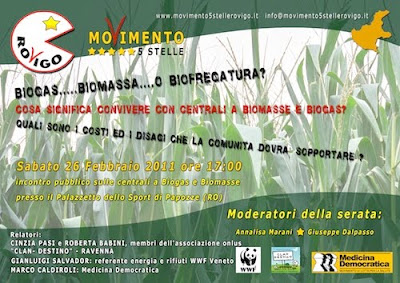 Mayor Papozze the question is "deaf ear", but meanwhile, for sure, someone è già in giro per le campagne deltizie, papozzane, e perfino in quelle di Bellombra a caccia di terreni da affittare, non per la solita “sbrancà de amoli”, ma offrendo fino a 1000 (mille) euri per ettaro. Bella somma, non c’è che dire, tanto da far pensare che la faccenda sia vera. Pare anche però che la cosa non vada giù liscia e tranquilla come “n’ombra fresca de vin bianco” ma singrumi in gola come nà fetta de mistocca, quel castagnaccio dolce-amaro che bisogna masticare bene per farlo andare giù. Ed è per questo che il movimento crescente delle 5 STELLE chiama cittadini e pubblica amministrazione ad un incontro - confronto che si terrà sabato 26 febbraio 2010 alle ore 17.00 at the sports hall of Papozze, to 19.00, you can return safely from Squilly for the usual train of spritz.